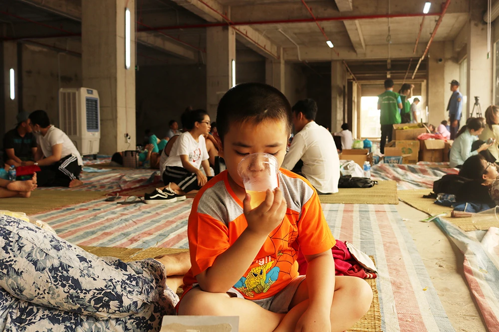Một bé gái vẫn cười hồn nhiên sau sự cố kinh hoàng tại nơi mình sinh sống vào sáng cùng ngày. Xung quanh em là gia đình và những đồ đạc, nhu yếu phẩm tạm thời cho thời gian sắp tới. Ảnh Nguyễn Tân.