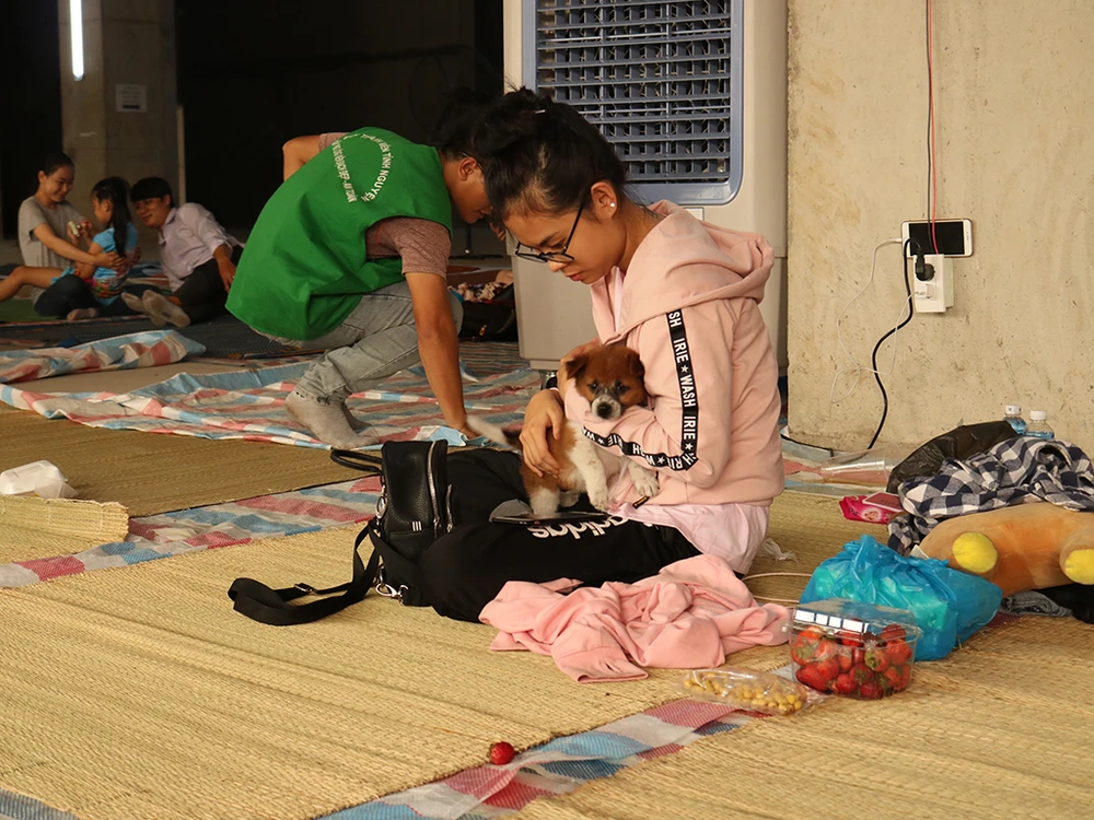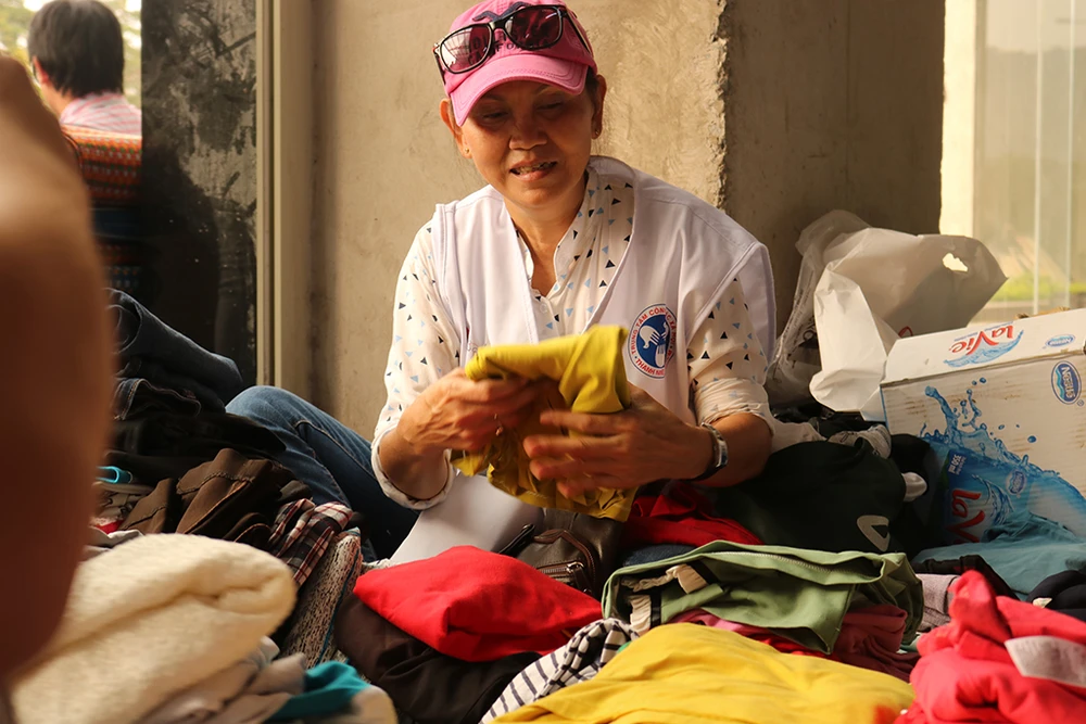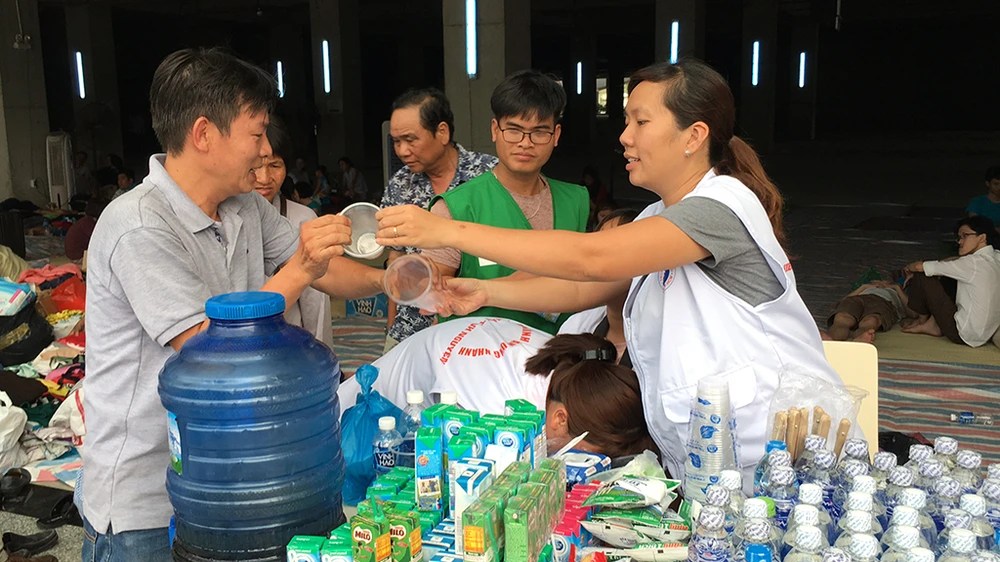 Một tình nguyện viên cho biết sau khi nghe tin đã chạy tới cùng những người khác hỗ trợ người dân. Nhiều đơn vị, mạnh thường quân đã huy động tiền bạc, áo quần, thức ăn để cấp phát miễn phí cho người dân. Ảnh Nguyễn Tân.