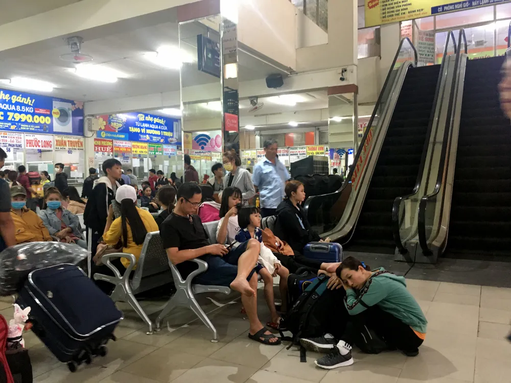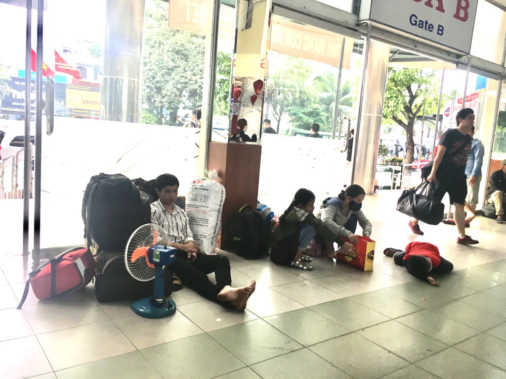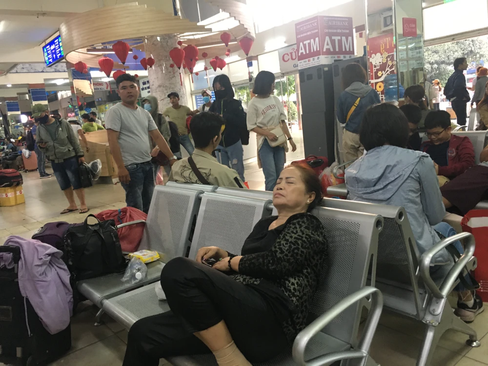 Những hàng ghế trong bến xe chật cứng người. Người đứng, người ngồi, người nằm la liệt. Vất vả nhất là những gia đình có con nhỏ, nhiều bé hiếu động chạy nhảy khắp nơi, có bé còn nhỏ quá khóc ngặt trên tay mẹ.