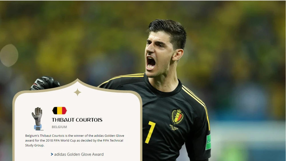 Trong khi đó, Harry Kane của Anh cũng giành giải chiếc giày vàng cho ngôi vua phá lưới World Cup khi anh ghi được 6 bàn thắng. Thủ thành của Bỉ, Thibaut Courtois nhận giải găng tay vàng giành cho thủ môn xuất sắc nhất giải, còn tiền đạo trẻ Kylian Mbappe của Pháp nhận danh hiệu cầu thủ trẻ xuất sắc nhất World Cup 2018.