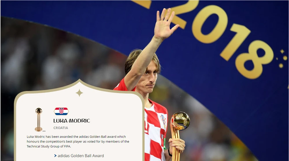 Kết thúc trận chung kết, LĐBĐ thế giới (FIFA) cũng công bố một số giải thưởng cá nhân và tập thể. Theo đó, không nằm ngoài dự đoán, tiền vệ tài hoa Luka Modric được bầu chọn là cầu thủ xuất sắc nhất World Cup 2018 (quả bóng vàng World Cup).