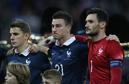 Những giọt nước mắt đã rơi trên SVĐ Wembley khi bài hát quốc ca Pháp La Marseilaise vang lên. Hậu vệ của Arsenal thi đấu dưới màu áo tuyển Pháp, Laurent Koscielny đã phải lau vội những giọt nước mắt, thủ thành Hugo Lloris cũng khóc. Gần 80.000 khán giả cùng những cầu thủ, quan chức có mặt trên sân đã hát vang bài quốc ca nước Pháp.