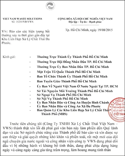 Ngày 19-8, Công ty TNHH Xử lý chất thải Việt Nam (VWS) đã gửi báo cáo tường trình về những hiện tượng bất thường xảy ra tại Khu liên hợp xử lý chất thải Đa Phước, huyện Bình Chánh, TP.HCM trong thời gian gần đây. Báo cáo này được gửi tới Thường trực Thành ủy, HĐND, UBND, Ủy ban MTTQ TP.HCM; Ban Tuyên giáo, Ủy ban Về người Việt Nam ở nước ngoài tại TP.HCM cùng các sở, ban ngành khác của TP.