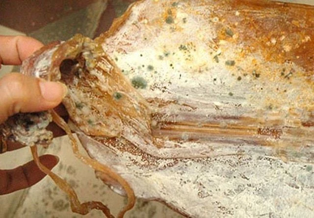Mực khô xuất hiện những đốm mốc xanh hoặc đen cần được loại bỏ và không nên sử dụng dưới bất kỳ hình thức nào. Ảnh: Internet