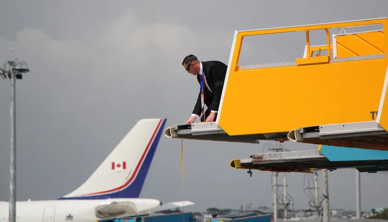 Trước khi đoàn tổng thống Mỹ tới sân bay Đà Nẵng thì các nhân viên mật vụ đã có mặt trước đó để kiểm tra, tính toán đến từng chi tiết cầu thang khi Tổng thống Trump bước xuống. Ảnh: LÊ PHI