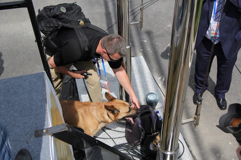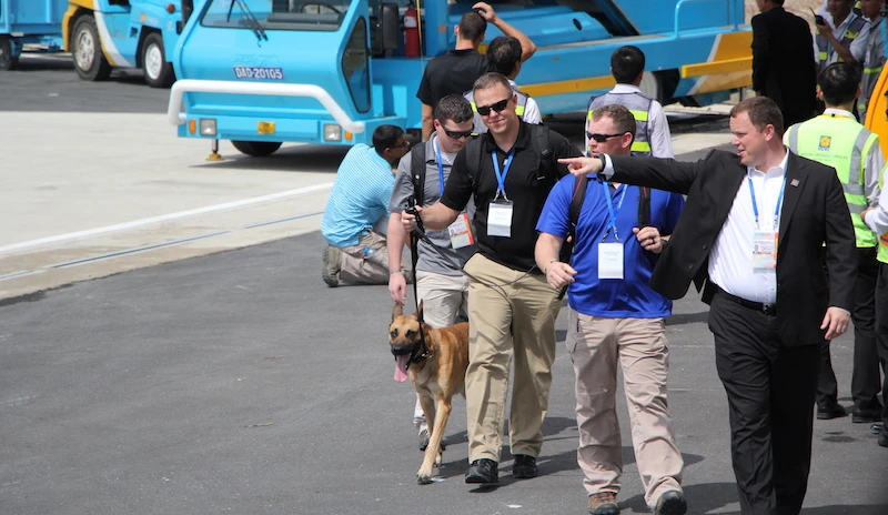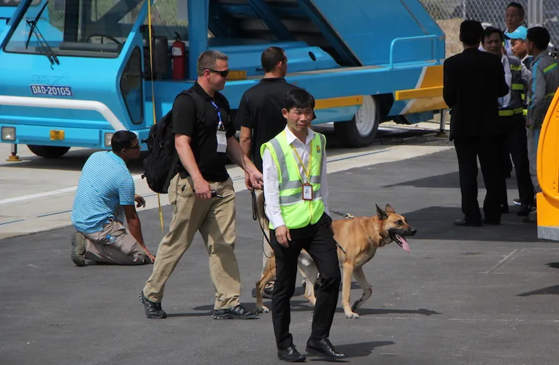 Chó nghiệp vụ lục soát mọi túi xách có mặt tại sân bay trước khi tổng thống Mỹ tới nơi. Ảnh: LÊ PHI
