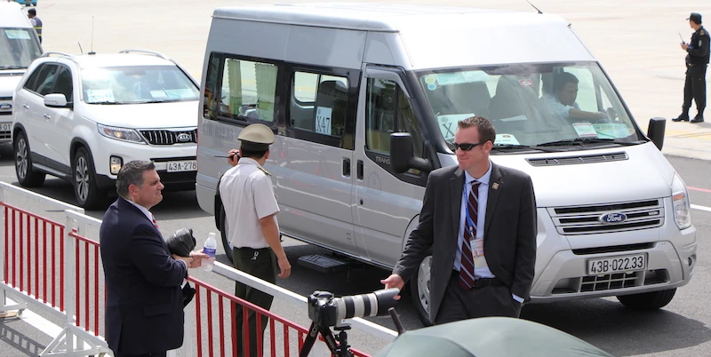 Cả một vòng vây mật vụ bảo vệ ngoại trưởng Mỹ khi ông này vừa đáp xuống sân bay, trước khi máy bay chở Tổng thống Mỹ Donald Trump xuống. Ảnh: LÊ PHI