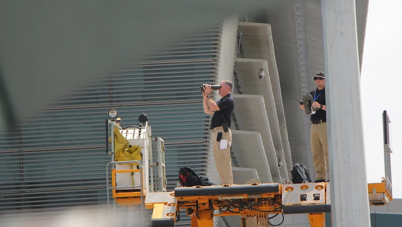 Đặc vụ Mỹ kiểm tra và khống chế các tầm cao tại khu vực sân bay để bố trí các lính bắn tỉa bảo vệ tổng thống Mỹ từ xa tại sân bay. Ảnh: LÊ PHI
