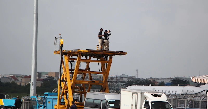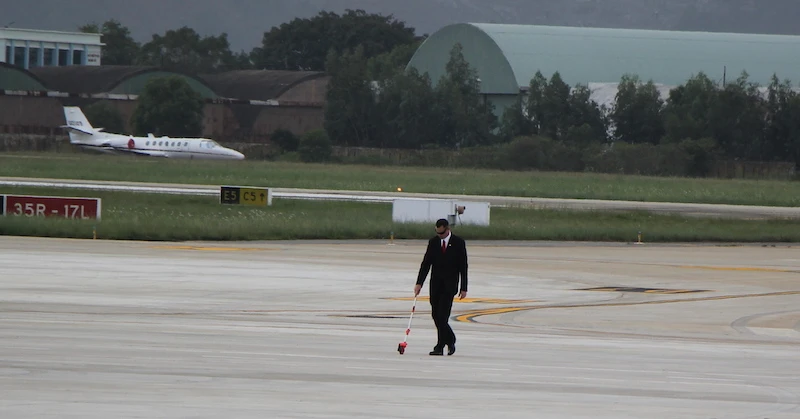 Họ tìm vị trí cao nhất tại lòng sân bay Đà Nẵng để kiểm tra độ tĩnh không, cao điểm nhằm bảo vệ lãnh đạo của họ một cách tốt nhất và ngăn chặn từ xa những bất trắc có thể xảy ra. Ảnh: LÊ PHI