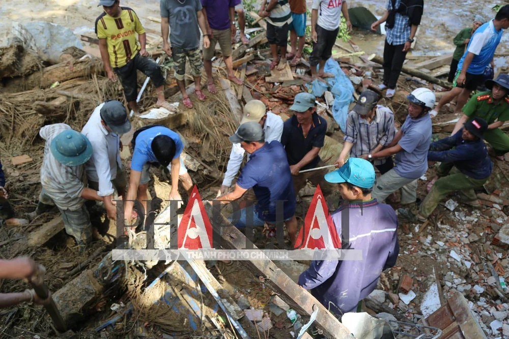 Người dân ở đây có phong tục sau khi tìm thấy thi thể người mất là an táng ngay. Trong ảnh: Người dân đang đào huyệt để an táng người mất vừa tìm được thi thể. Ành: HIẾU SANG