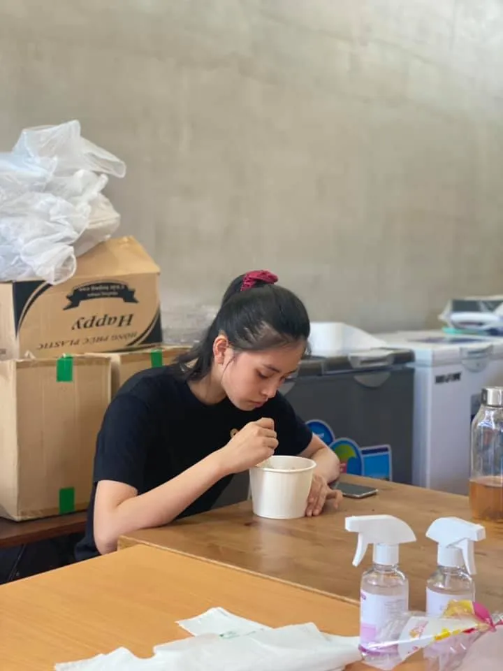 Hoa hậu Tiểu Vy tới sớm để chuẩn bị những bữa cơm cho bà con lao động và cán bộ trên tuyến đầu chống dịch. Ảnh: TRẦM HỒNG NGỌC