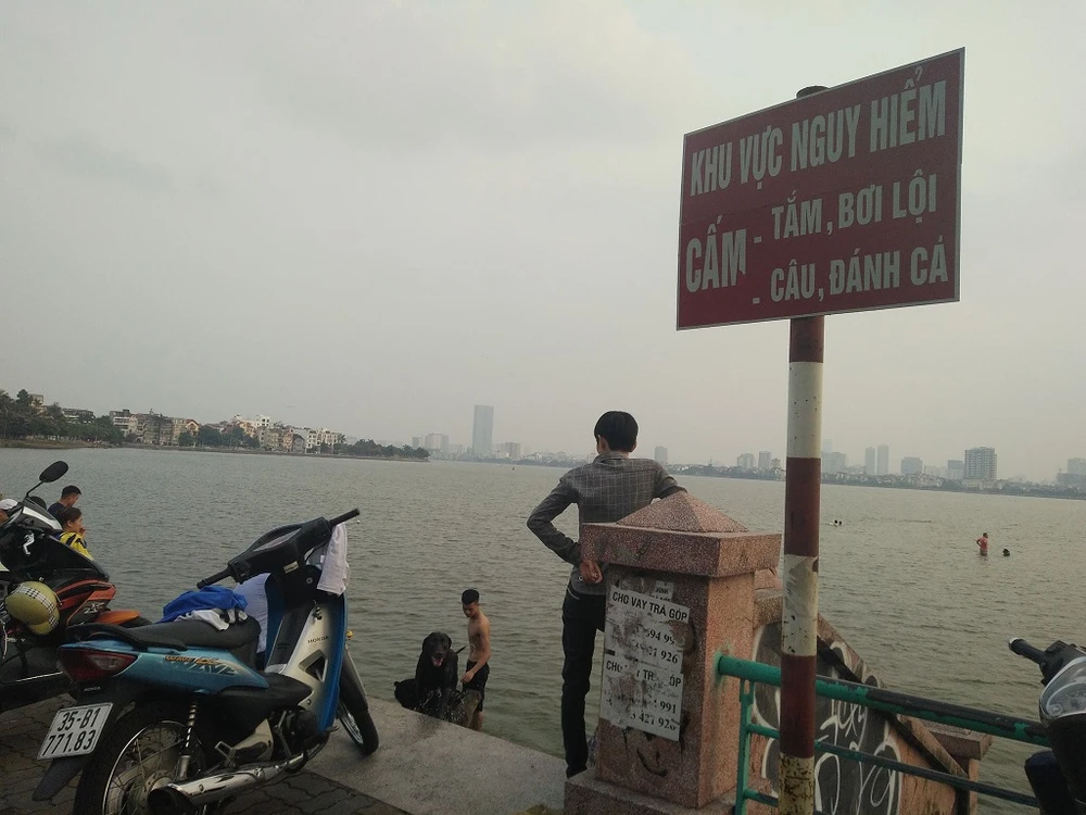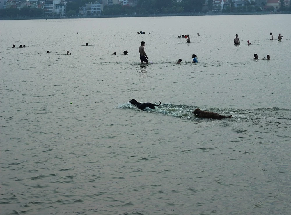 Do quá nóng, bất chấp biển cấm, nhiều người dân dẫn theo thú cưng đổ xô ra Hồ Tây để tắm.