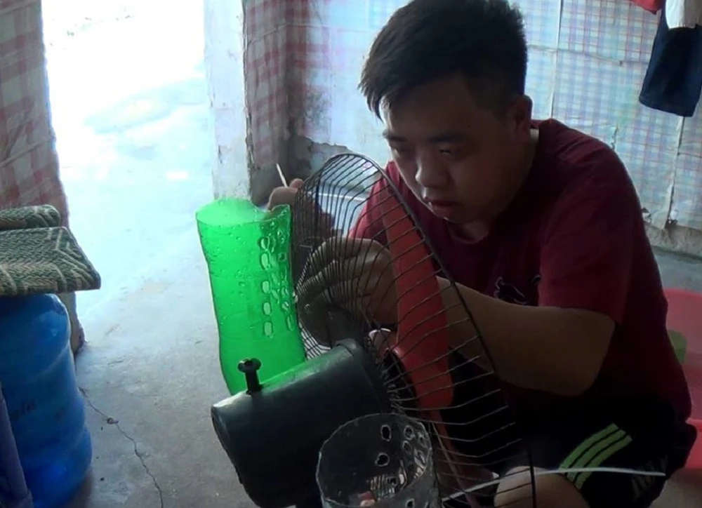 Hoặc một vài bạn thiết kế máy chống nóng thủ công. Trong ảnh là một sinh viên buộc hai vỏ chai nhựa vào sau chiếc quạt, sau đó cho đá hoặc nước mát vào, khi quạt chạy sẽ khiến không khí mát hơn. Mẹo vặt này được cậu học hỏi khi lên mạng Internet tìm hiểu. Tuy nhiên, cách này cũng chỉ giúp giảm nóng không đáng kể.
