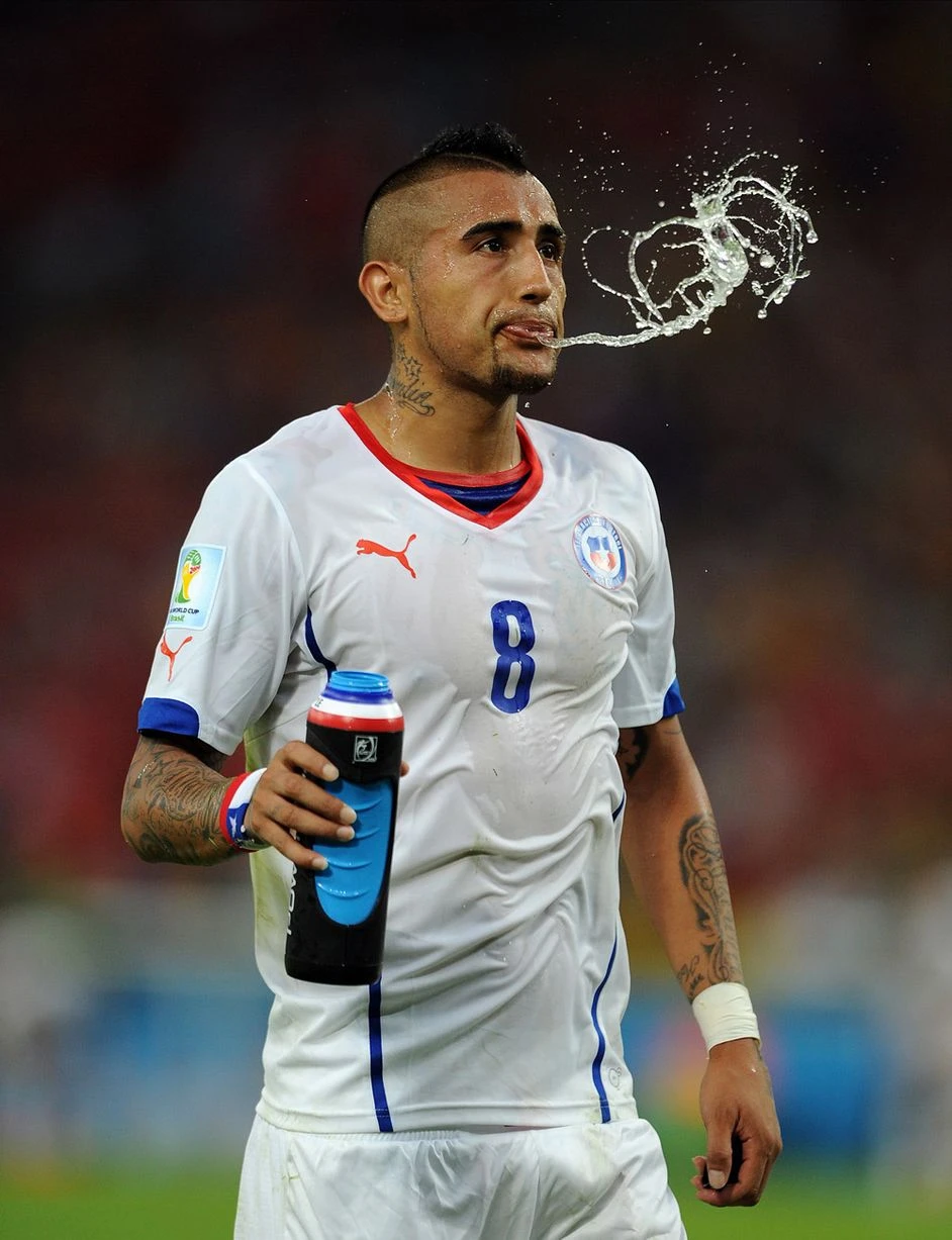 Arturo Vidal của Chile phun nước trong trận đấu tại World Cup giữa Chile và Tây Ban Nha.
