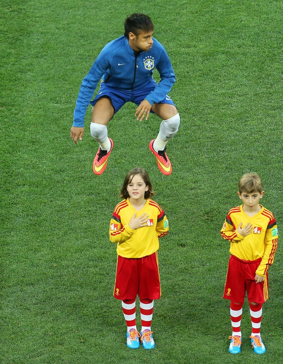 Neymar bật nhảy rất cao sau khi hát quốc ca Brazil.