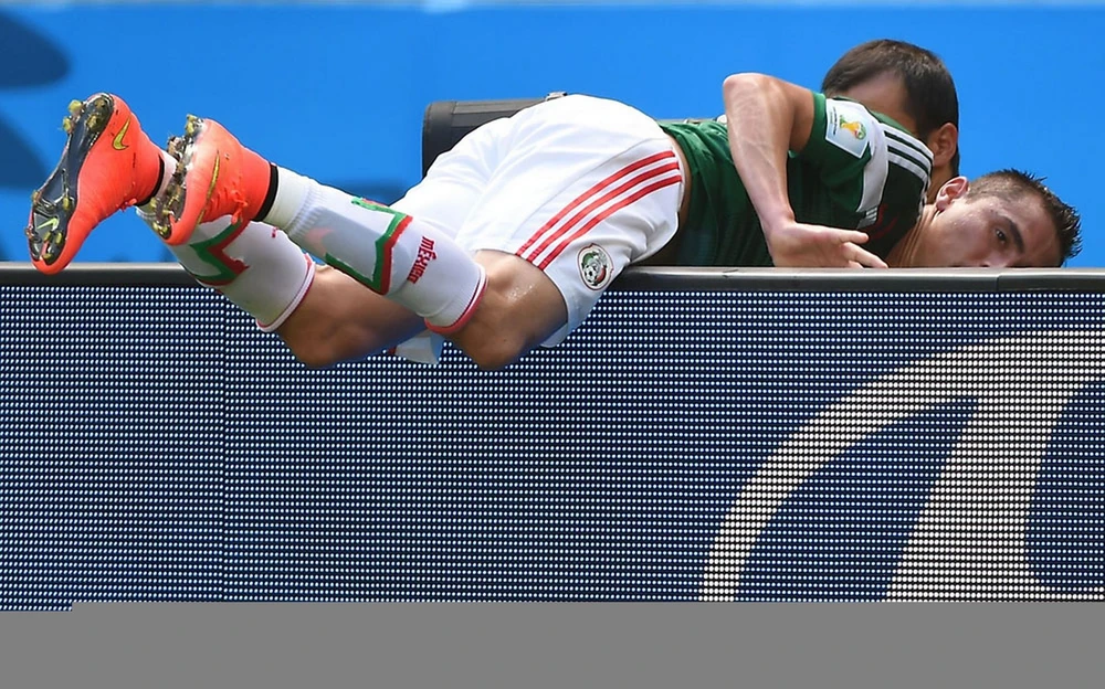 Hậu vệ 21 của Mexico Paul Aguilar nằm trên hàng rào quảng cáo sau khi chạy lố đà.