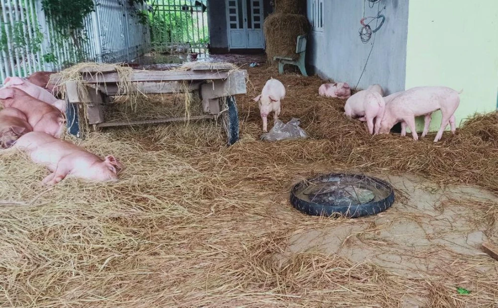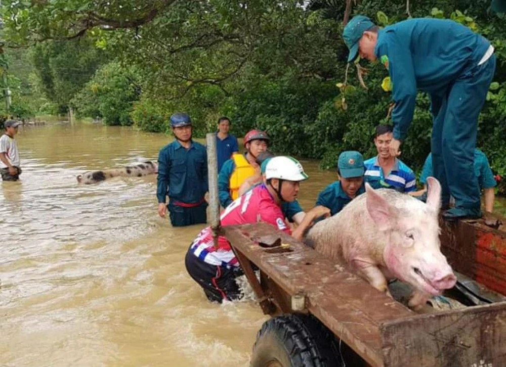 Lực lượng chức năng đưa heo ra khỏi những khu vực bị ngập sâu.