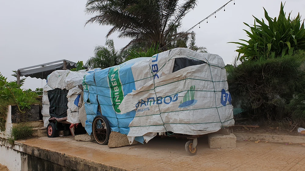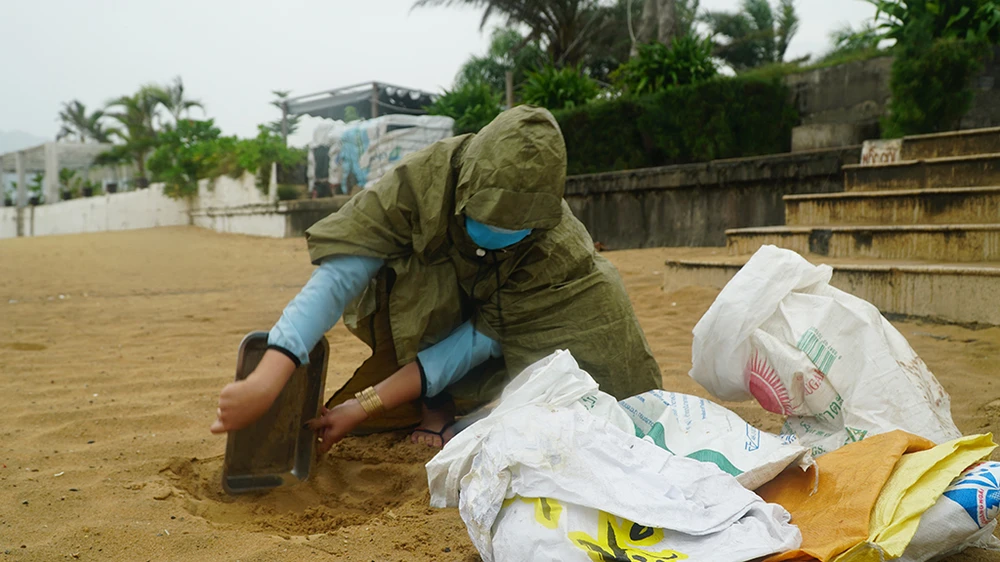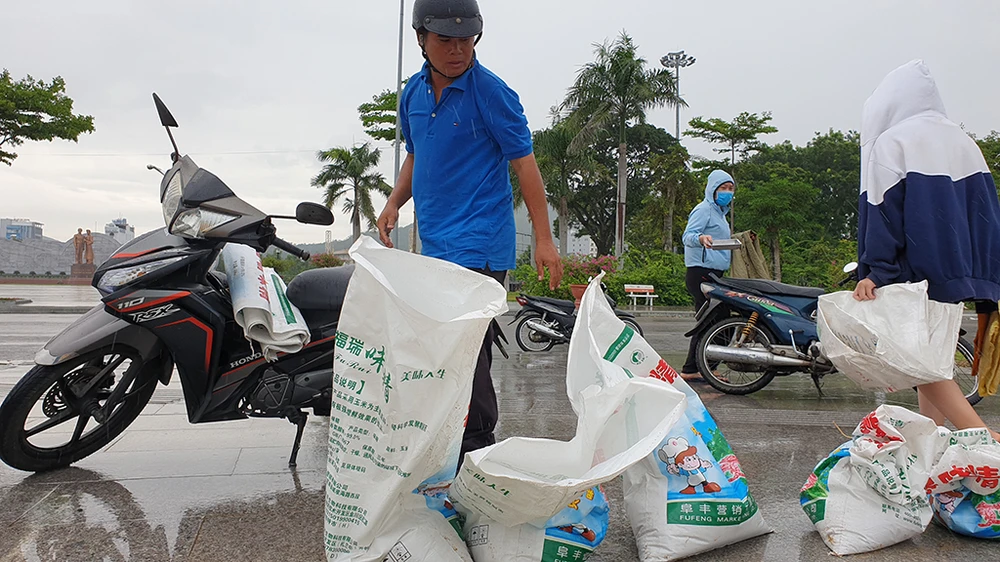 Chị Huỳnh Thị Bích Hạnh, ngụ TP Quy Nhơn cho biết gia đình cũng khá lo lắng khi bão số 9 sắp đổ bộ. Để đảm bảo cho tài sản gia đình, chị Hạnh cùng người thân ra biển xúc cát về chằng chống nhà cửa.