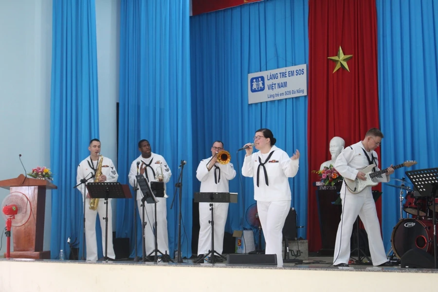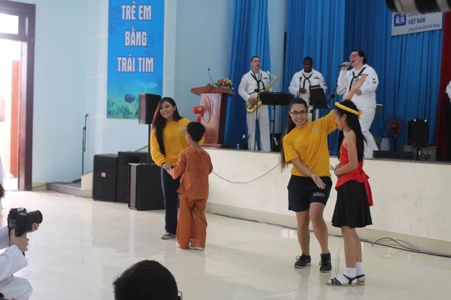 Buổi giao lưu đã diễn ra trong không khí vui vẻ và gần gũi. Các em nhỏ Làng trẻ em SOS hào hứng “chiêu đãi” đoàn khách quý tới từ Hoa Kỳ những tiết mục múa hát đặc sắc, mang đậm văn hóa Việt Nam. Đáp lại, ban nhạc Hải quân Hoa Kỳ cũng khuấy động không khí bằng các ca khúc sôi động, trẻ trung.