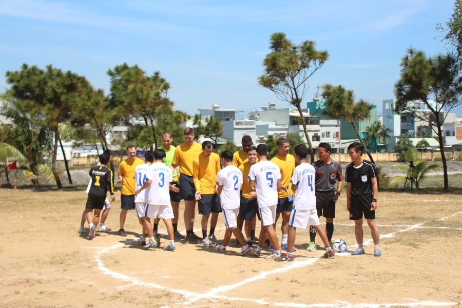 Thủy thủ Hoa Kỳ đá bóng giao lưu với các thiếu niên Làng trẻ em SOS Ảnh: TÂM AN