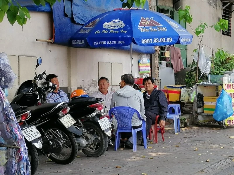Một số người không đeo khẩu trang tập trung uống cà phê trên đường Phạm Văn Đồng, quận Bình Thạnh.