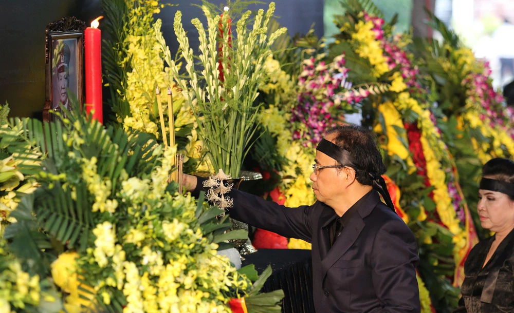 Ông Lê Mạnh Hà, con trai Đại tướng Lê Đức Anh cùng các thành viên trong gia đình thắp nhang tiễn biệt ông.