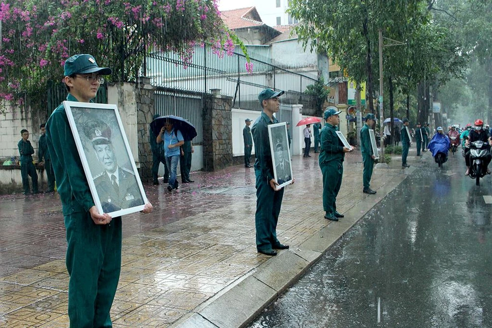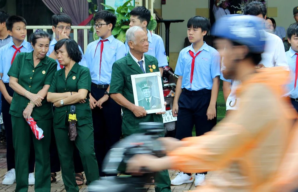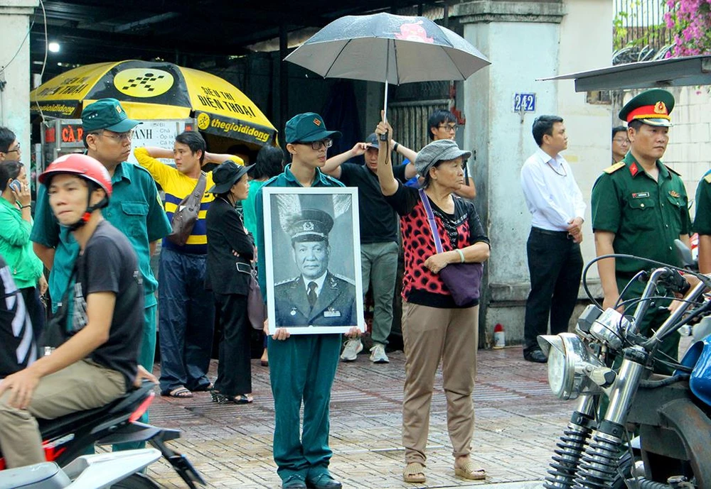 Còn ông Phương Minh Trí (71 tuổi, Hội Cựu chiến binh phường 6, quận 3) cũng đến ôm di ảnh của Đại tướng Lê Đức Anh, mắt không ngừng hướng về xa, đợi đoàn xe đưa lĩnh cữu của Đại tướng đến.