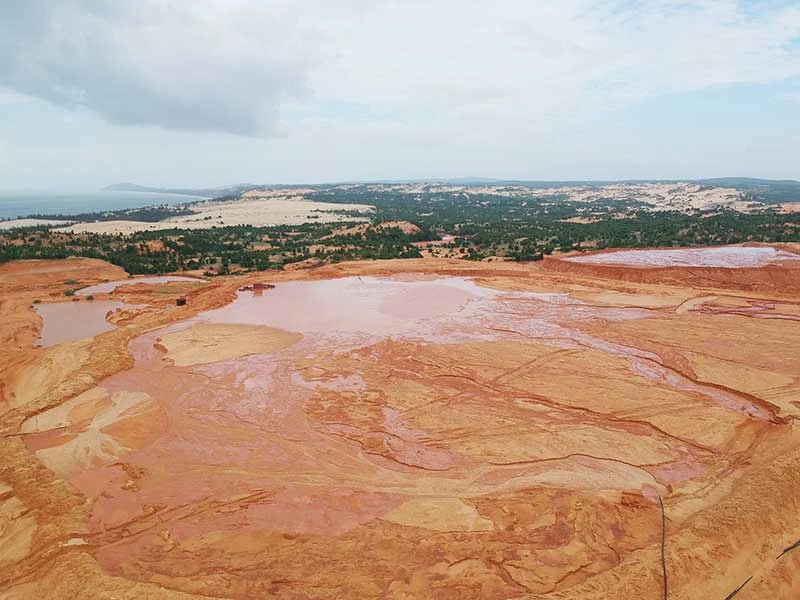 | Liên tục vỡ hồ, bùn đỏ tuôn như thác Chỉ từ năm 2010 đến nay, ít nhất đã có bảy vụ vỡ hồ chứa nước - bùn đỏ ở các mỏ khai thác titan tại Bình Thuận. Vụ vỡ hồ chứa bùn gần đây nhất xảy ra vào tháng 6-2016, tại mỏ khai thác titan của Công ty Tân Quang Cường (xã Thuận Quý, huyện Hàm Thuận Nam, Bình Thuận). Lượng bùn đỏ từ mỏ này tuôn như suối, tràn qua nhiều khu dân cư, khu du lịch và chảy ra tới biển, gây nhiều thiệt hại. Đơn vị để xảy ra vỡ hồ nhiều nhất là Công ty Cổ phần Đầu tư khoáng sản và Thương mại Bình Thuận với ba vụ. Trong đó có vụ lượng bùn đỏ tuôn chảy hơn 3 km. |