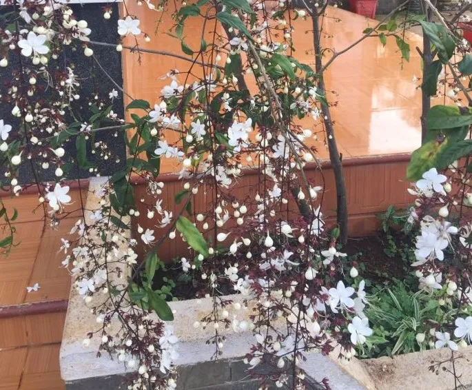 Những cây hoa trắng rũ cành, nhìn rất bình dị nhưng được nhiều người dân Tây Nguyên trồng ngay trước thềm nhà. Ảnh: Võ Nguyên