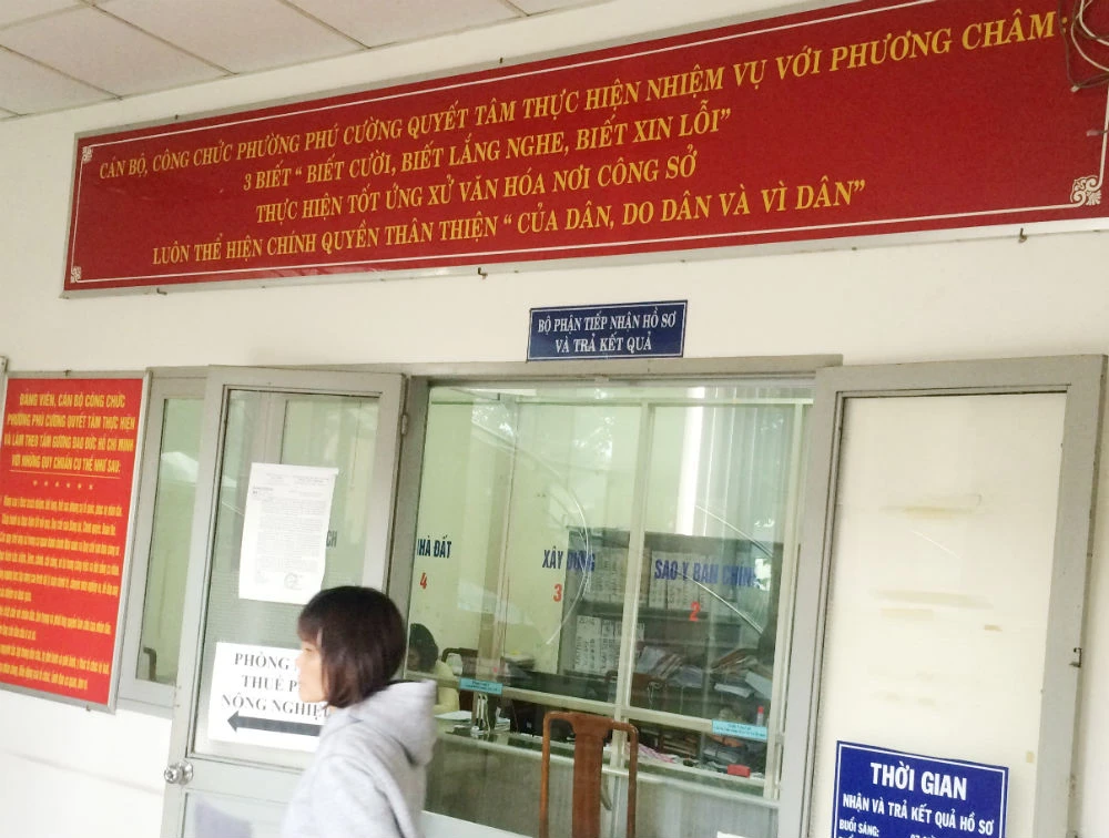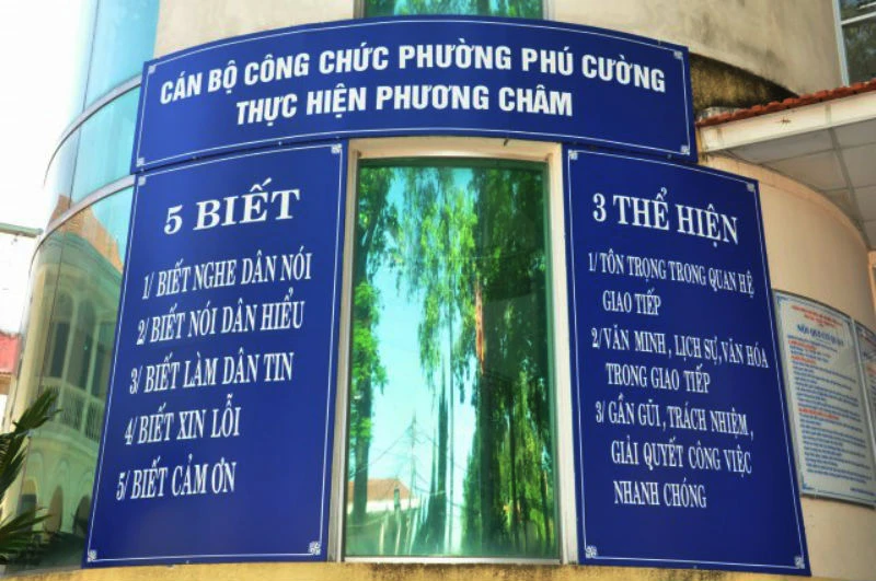 Khi bước vào phía trong nơi giải quyết thủ tục hành chính, một tấm bảng màu đỏ dòng chữ vàng treo trước cửa với dòng chữ: Cán bộ công chức phường Phú Cường quyết tâm thực hiện nhiệm vụ với phương châm 3 biết: “Biết cười, biết lắng nghe, biết xin lỗi” và thực hiện tốt ứng xử văn hóa nơi công sở, luôn thể hiện chính quyền thân thiện “của dân, do dân và vì dân”.