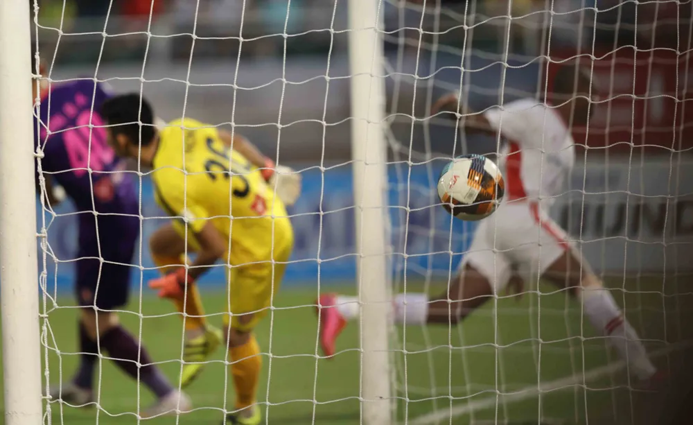 Điều chờ đợi trong khắc khoải của đội khách đã đến ở phút 18, tiền đạo Bruno đánh đầu vừa đủ đưa bóng vào lưới Phạm Văn Phong, sau pha đá phạt như lập trình của Hoàng Đức.