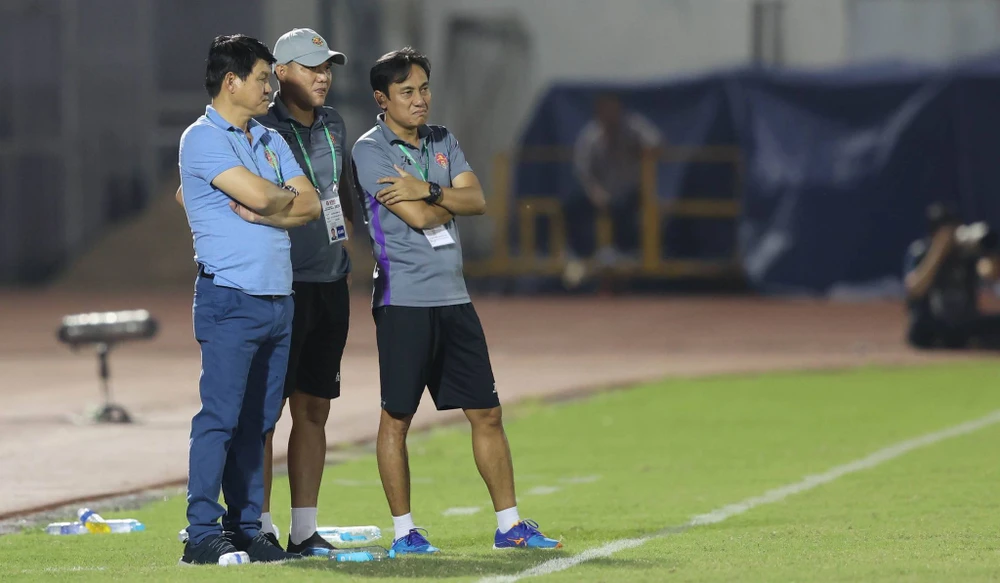 ... trong lúc Ban huấn luyện của Sài Gòn FC buồn bã sau một tích tắc mất tập trung của cả hàng phòng ngự.