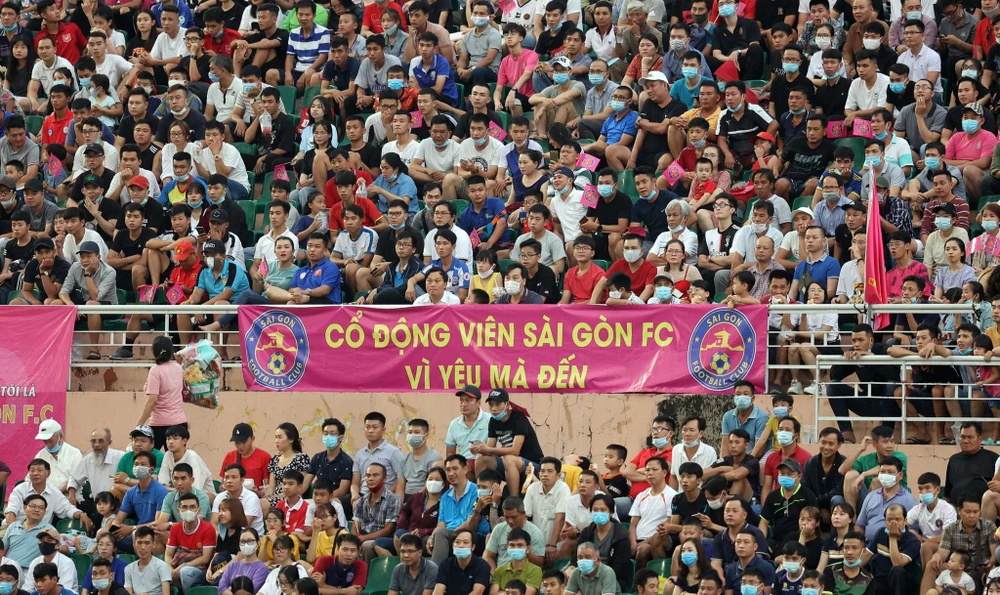 Tưng bừng nhất ở các khán đài là giới cổ động viên Sài Gòn FC "vì yêu mà đến" lúc nào cũng sôi nổi dù đội nhà đang thua...