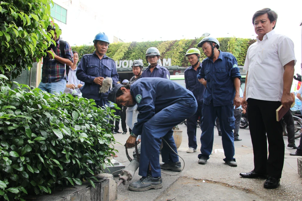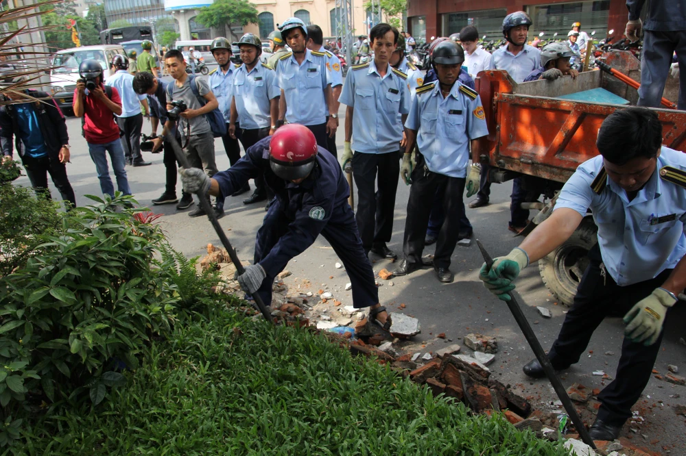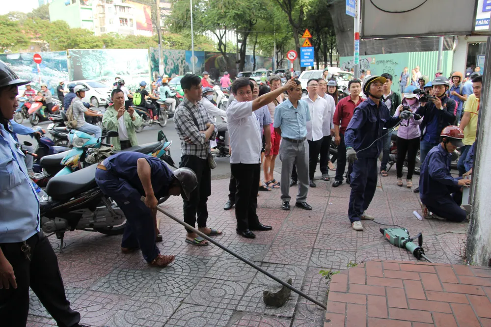 Phó Chủ tịch quận 1 chỉ đạo phá bỏ bồn cây trước Trung tâm Bồi dưỡng chính trị quận 1 để trả lại lối đi cho người đi bộ.