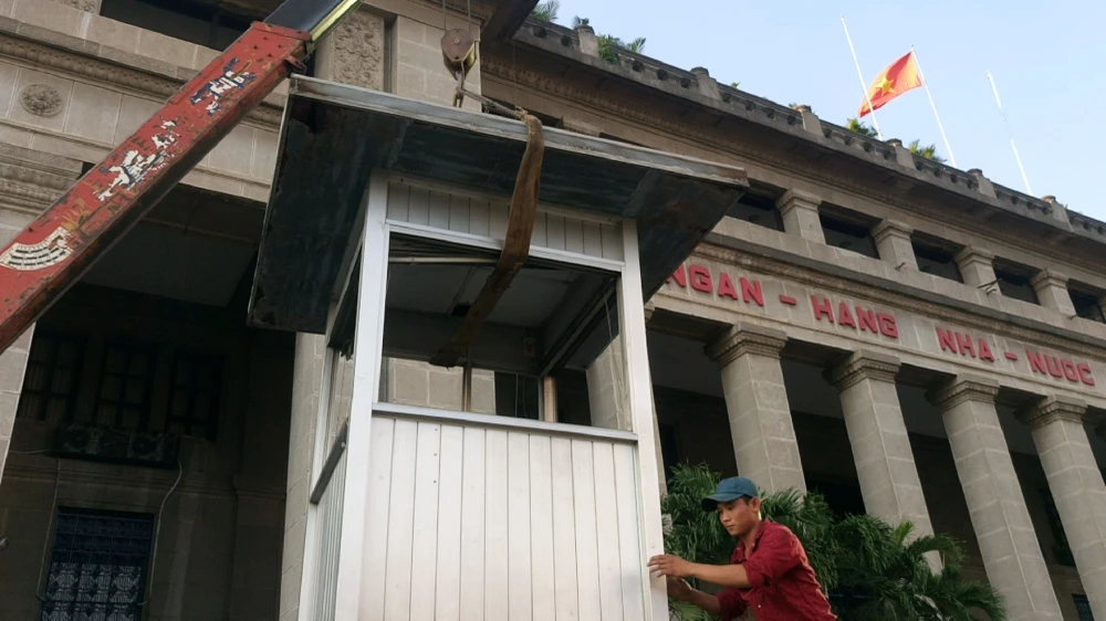 Ông Hải cho cẩu cả vọng gác công an trước trụ sở Ngân hàng Nhà nước trên đường Võ Văn Kiệt.