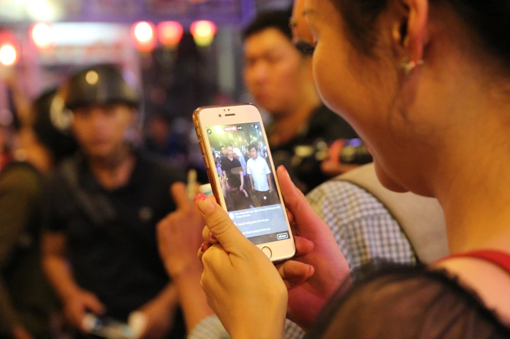 Người dân hiếu kỳ đang livestream trực tiếp lên Facebook một lần ông Hải ra quân giành lại vỉa hè.
