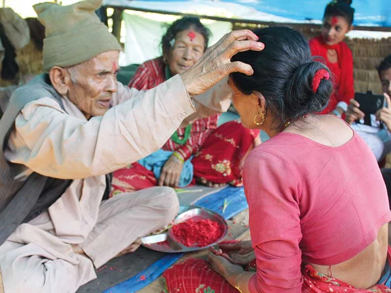 Mấy ngày ở nhà bạn, hôm nay tôi mới được ăn một bữa có thịt với đủ thứ món từ thịt dê, từ cà ri kiểu Nepal đến dê nướng kiểu Việt Nam do tôi trổ tài. Một lát sau, sân nhà bạn tôi đông nghịt họ hàng đến viếng. Ai nấy xúng xính trong những bộ quần áo đẹp nhất, gương mặt rạng rỡ niềm vui. Ông bà của bạn tôi ngồi trên giường cho đàn con cháu chúc tết. Tôi cũng được gia đình cho tham gia chúc phúc. Ông bà giắt trên tóc chúng tôi lá của những cây bắp con, đắp lên trán chúng tôi những nắm hạt nếp đỏ và lầm rầm chúc may mắn. Mọi người từ lớn đến nhỏ nghiêm túc và kính cẩn quỳ gối trước cha mẹ, ông bà, trân trọng đón nhận những lời chúc. Không khí thiêng liêng và tình cảm đó làm tôi rưng rưng nước mắt.