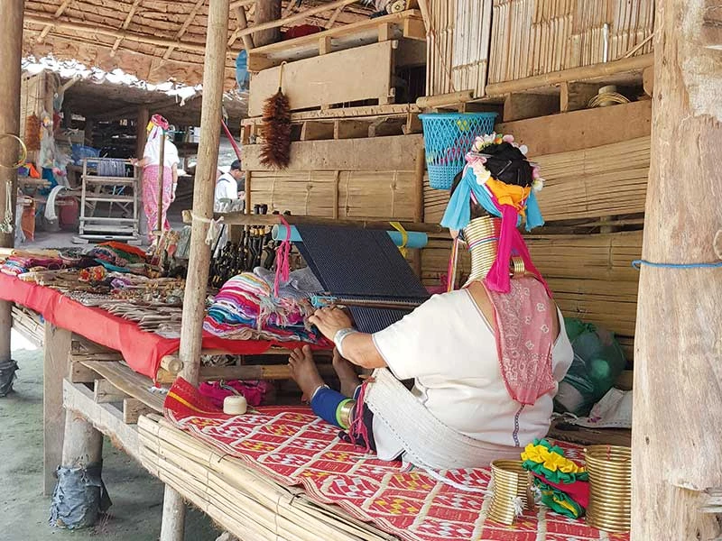 Dẫn tôi lên nhà, em chỉ nơi em ngủ và kia là phòng của ba mẹ. Ngôi nhà trống trơn, sàn tre mong manh. Tôi nhìn khắp nhà, thở dài khi thấy tài sản quý giá nhất là mấy con cá suối đang nướng trên bếp. Muốn trải nghiệm cảm giác làm người Karen, tôi mượn chiếc vòng cổ nhỏ nhất và chỉ đúc một nửa mặt trước (chắc là quà lưu niệm bán cho khách cho dễ mang) mang lên cổ. Em dịu dàng cột tóc, cài hoa và đắp bột thanaka truyền thống của Myanmar lên mặt tôi. Mẹ em với chiếc cổ dài thật dài đang dệt vải gần đó, thỉnh thoảng nhìn chúng tôi mỉm cười hiền lành. Lại một nụ cười mỉm, không phải vì thói quen sở thích mà bởi những vòng cổ dài quá cằm vướng víu không cho người ta cười tự nhiên. Mang vòng một chút thôi mà tôi đã bị đau không thể nào chịu nổi. Gỡ vòng ra hồi lâu mà vẫn còn dư âm hồi lâu. Vậy mà những người Karen cổ dài đã phải gắn suốt cuộc đời mình với những chiếc vòng nặng hơn gấp bao nhiêu.