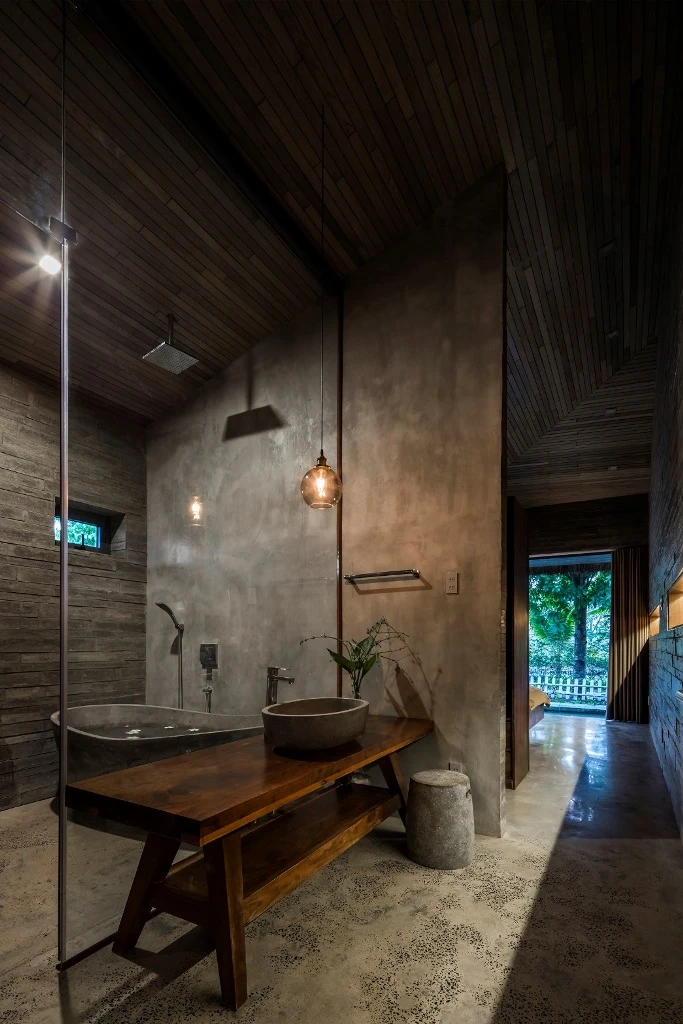 Nhà vệ sinh Am house (CTA | Creative Architects) có bồn lavabo bên ngoài khu tắm.