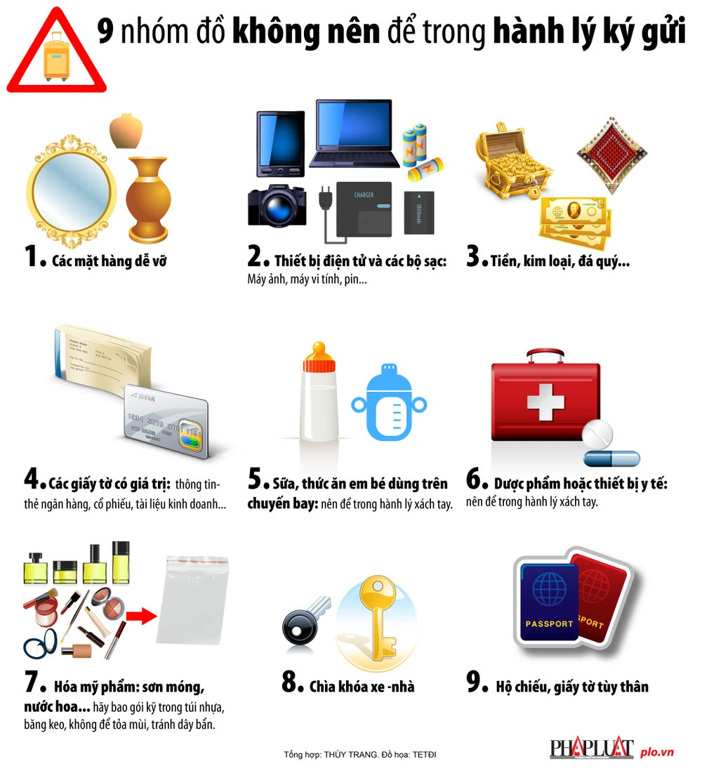 (PLO) - Sau một số sự việc mất đồ trong hành lý ký gửi khi đi máy bay như: tiền bạc, nữ trang, thiết bị điện tử,... dưới đây là 9 nhóm đồ không nên để trong hành lý ký gửi.