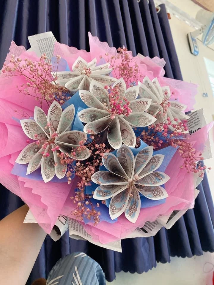 Những bó hoa bằng tiền lẻ thể hiện sự đầu tư của người tặng.