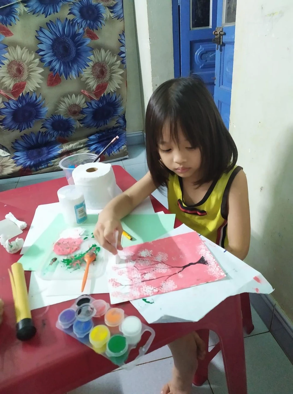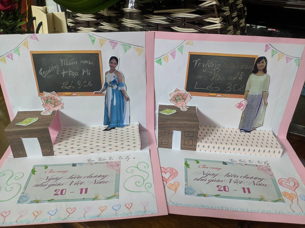 Thay vì mua thiệp, các em học trò được cha mẹ hướng dẫn tự tay làm thiệp tặng cô giáo.