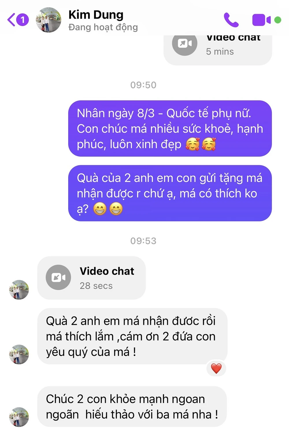“Nhà tôi có hai con trai thôi nhưng đứa nào cũng chu đáo và gần gũi với mẹ. Lúc thằng anh đi học, thằng em ở nhà thì em sẽ thay anh mua hoa và bánh cho mẹ dịp đặc biệt. Bây giờ hai anh em đi học, đi làm xa cả rồi nhưng vẫn rủ nhau gửi quà về cho mẹ. Tôi đôi khi cũng la rầy vì ngại tốn kém nhưng trong lòng thì hạnh phúc lắm vì các con luôn hiếu thảo, biết quan tâm đến mình” - bà Kim Dung chia sẻ.