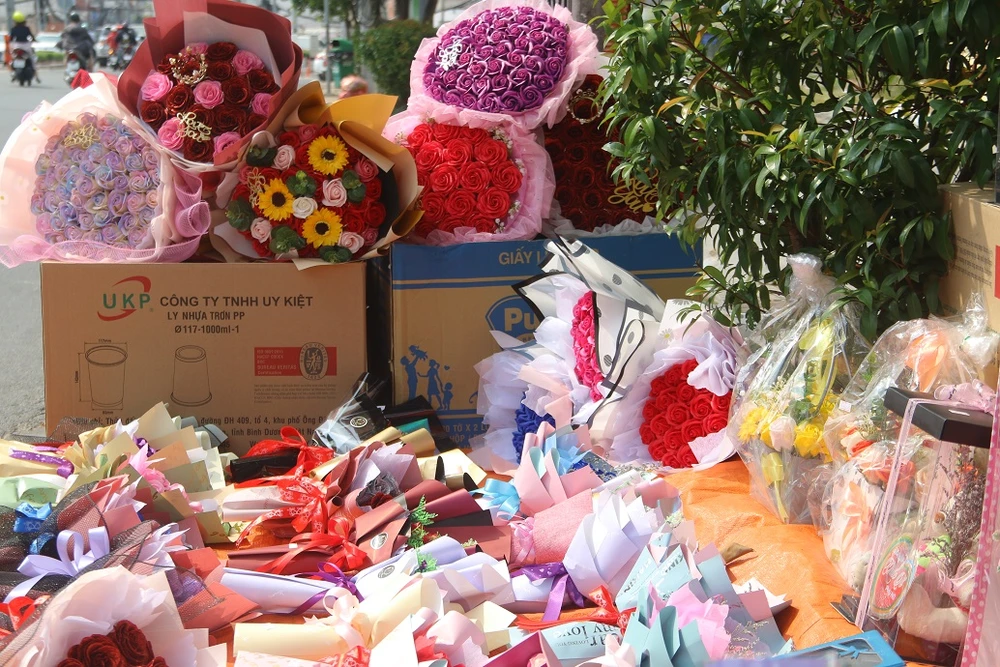 Lề đường TP.HCM chưng bán rất nhiều bó hoa dịp 8-3. Ảnh: THẢO PHƯƠNG