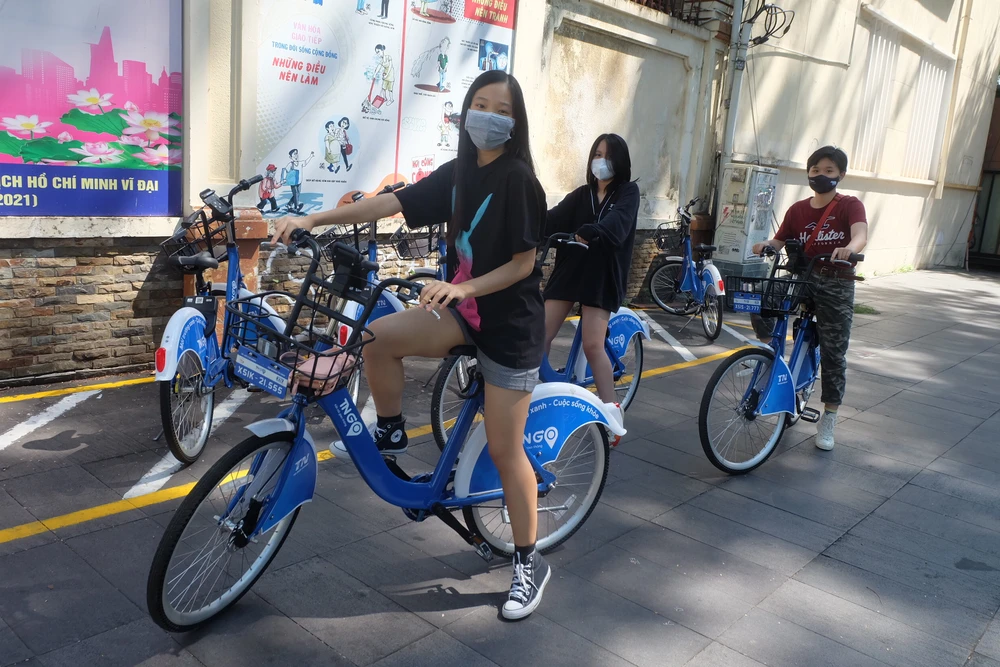 Nhiều bạn trẻ chọn thuê xe đạp công cộng để dạo chơi, ngắm nhìn đường phố.