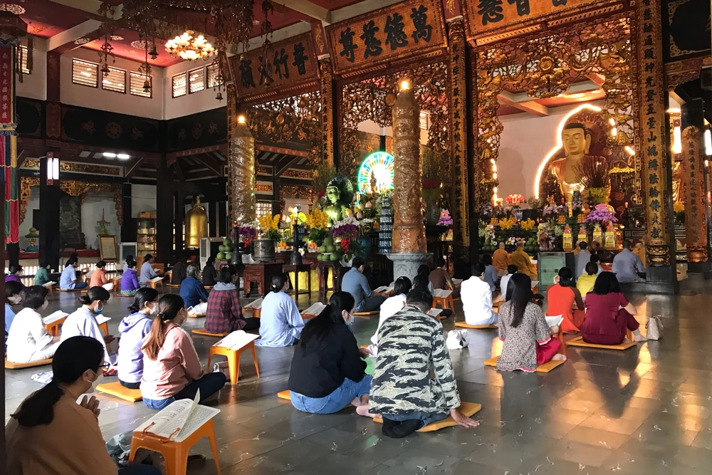 Tại chùa Vĩnh Nghiêm (quận 3, TP.HCM) từ sáng sớm đã đón tiếp hàng trăm lượt khách đến thắp nhang, cầu bình an.