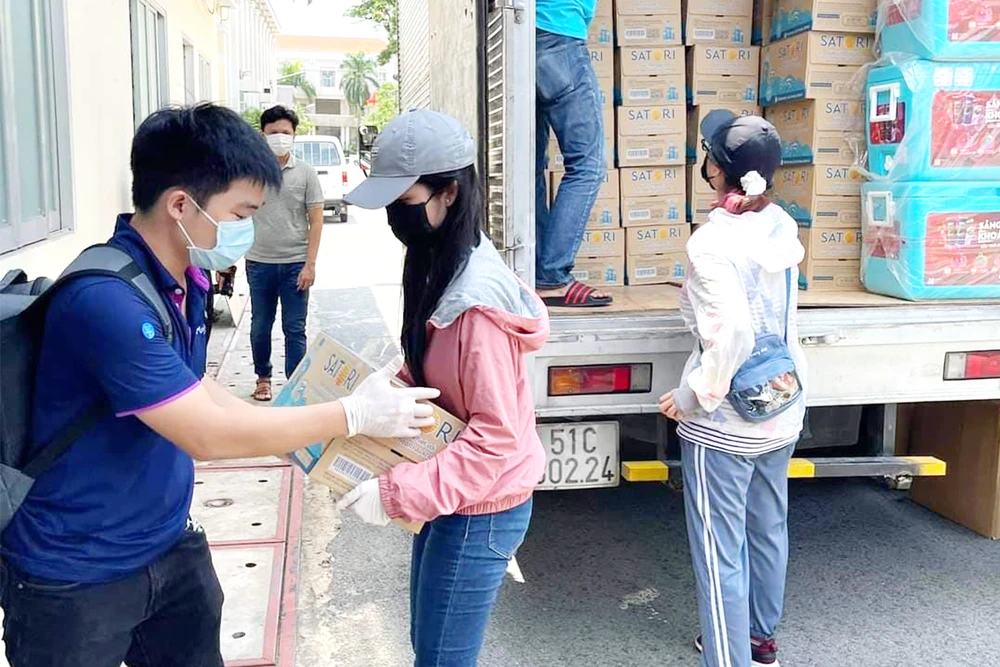 Những chai nước hoa quả, bánh, sữa, đồ bảo hộ đã được gửi tới các bệnh viện (BV), khu cách ly, khu công nghiệp có người nhiễm COVID-19… theo cách an toàn nhất.