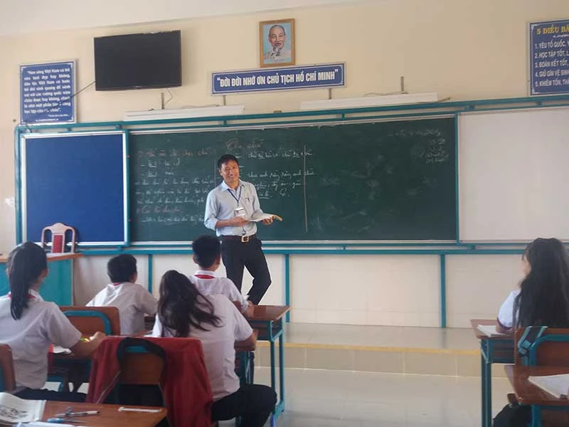Thầy Cương đã có bảy năm công tác tại trường và ngày càng gắn bó hơn với học sinh ở xã đảo Thạnh An. Ảnh: NVCC