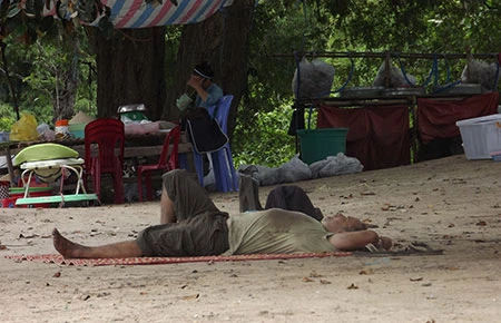 Đang giữa buổi trưa, TS Philip Piper John nằm ngay trên khoảng sân đất, dưới tán cây vú sữa đánh một giấc bụi bặm ngon lành.
