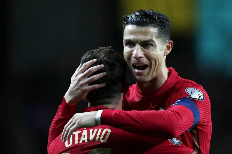 Ông anh Ronaldo chúc mừng cậu em Otavio mở hỏa lực giúp Bồ Đào Nha đánh bại Thổ Nhĩ Kỳ 3-1.
